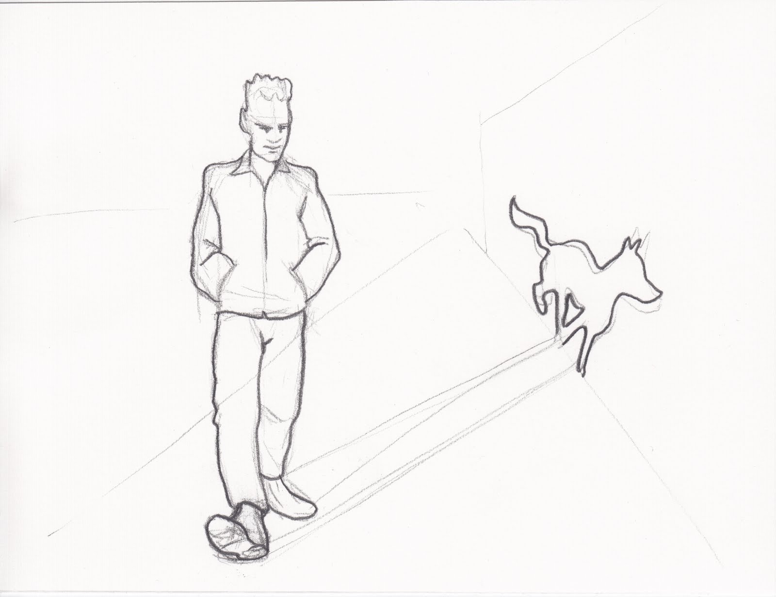 Älä ajattele luonnostellessa niin paljon sitä ääriviivaa, vaan piirrä ensin koko luuranko (samalla voit piirtää varjokoiralle luurangon suunnilleen vastaavaan asentoon, nythän näillä ei oo mitään suhdetta), lisää lihat päälle ja sitten vasta takki ja housut, ja hep - nivelet ja muut on automaattisesti oikeilla paikoillaan.
