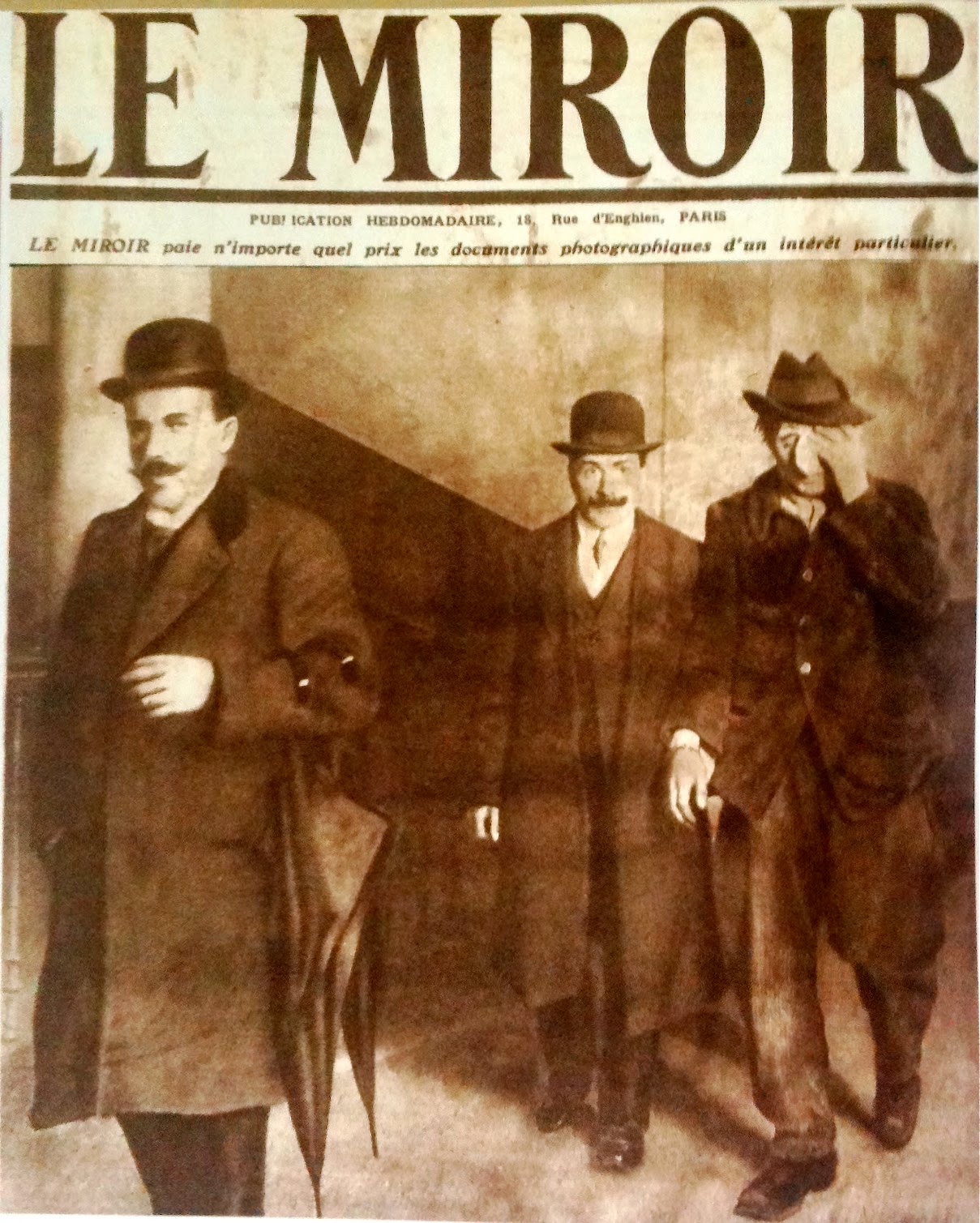 Löysin muuten tuon kuuluisan Le Miroir-lehden kansikuvan 2.3.1919, joka oli Hergen arkistossa. Kuvassa kävelee kaksi viiksekästä, knallipäistä poliisia pidätetyn miehen kanssa. Toinen taluttaa miestä ja toinen kantaa käsivarrellaan herrojen sateenvarjoja. Kuin ilmetyt Dupondtit.