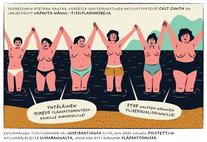 Sosiaalisen median myötä myös täällä vallitsevat tiukat kansainväliset normit paljaan pinnan suhteen. Voiko olla enää erillistä suomalaista tapaa suhtautua alastomuuteen? Voiko suhtautuminen muuttua? Meretoja toivoo muutosta ja tissirauhaa. Ehkä se on mahdollista, onhan esimerkiksi suhtautuminen tupakointiin julkisissa tiloissa muuttunut hyvin nopeasti.