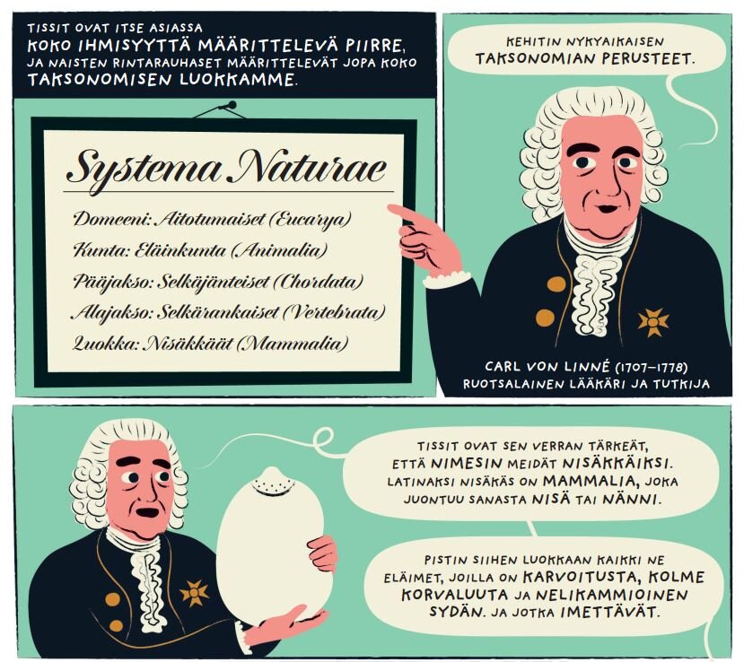 Aikaisemmin pääasiassa kuvittajana toiminut Pinja Meretoja (s. 1982) on tehnyt ensimmäisen sarjakuvakirjansa. Tissilogia on, kuten alaotsikko määrittää, tietoteos rintojen merkityksistä, myyteistä, painolastista ja vapautumisesta.